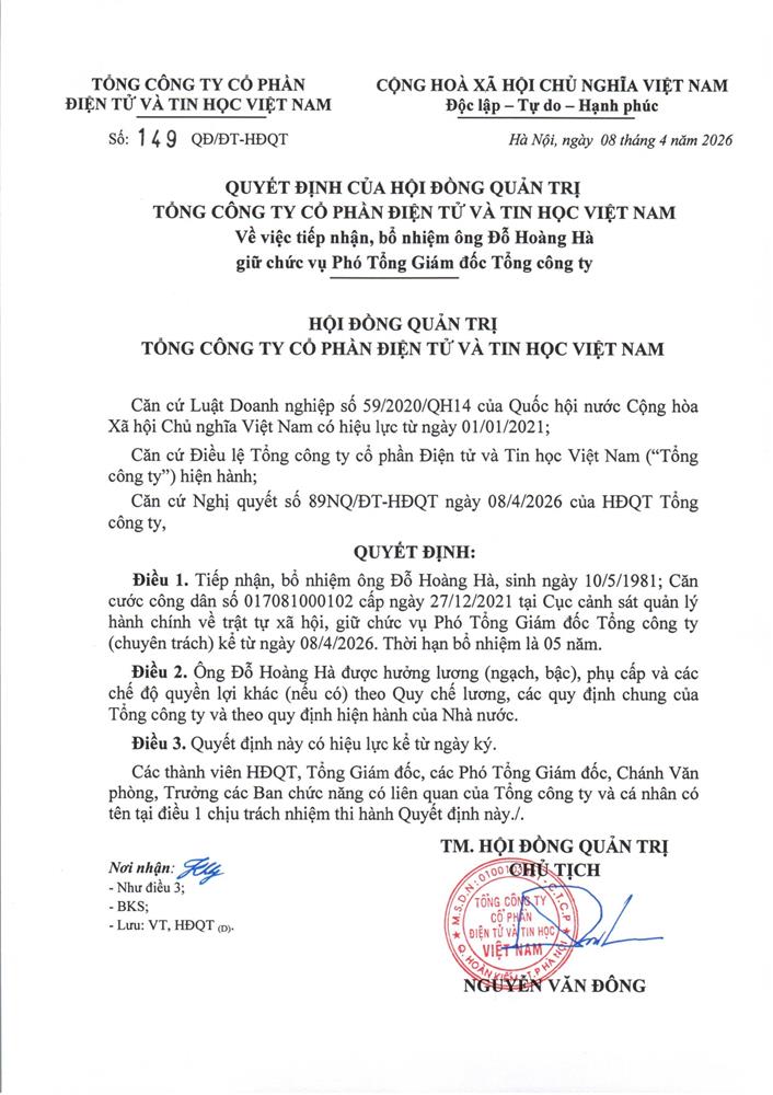 Bổ nhiệm Ông Đỗ Hoàng Hà giữ chức vụ Phó Tổng Giám đốc Viettronics kể từ ngày 08/4/2026