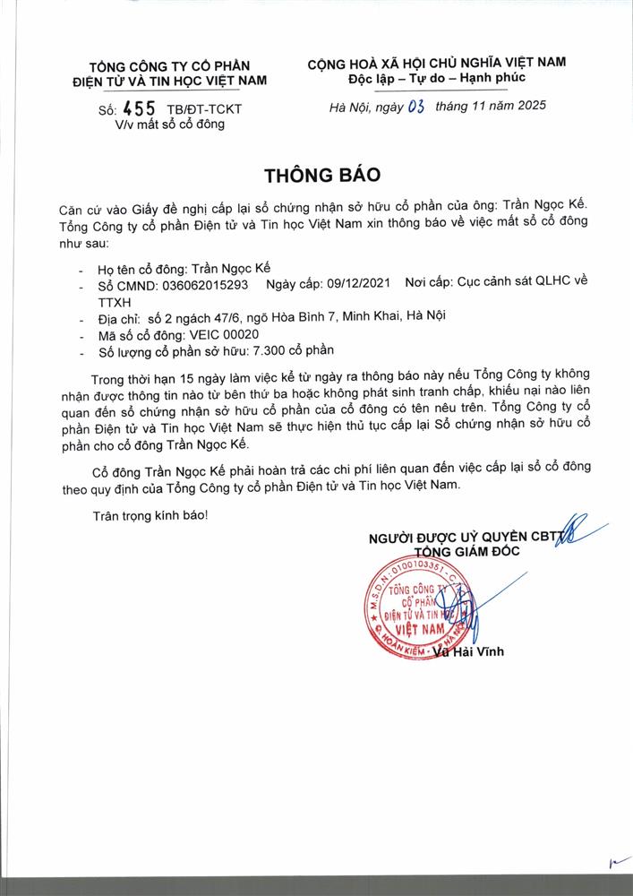 • Thông báo mất sổ cổ đông ông Phạm Văn Dũng (31/10/2025)