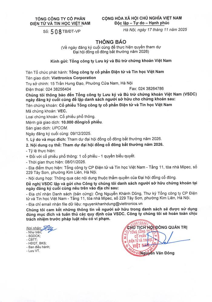 • Miễn nhiệm chức vụ Tổng Giám đốc Viettronics đối với Ông Vũ Hải Vĩnh kể từ ngày 10/11/2025 (10/11/2025)