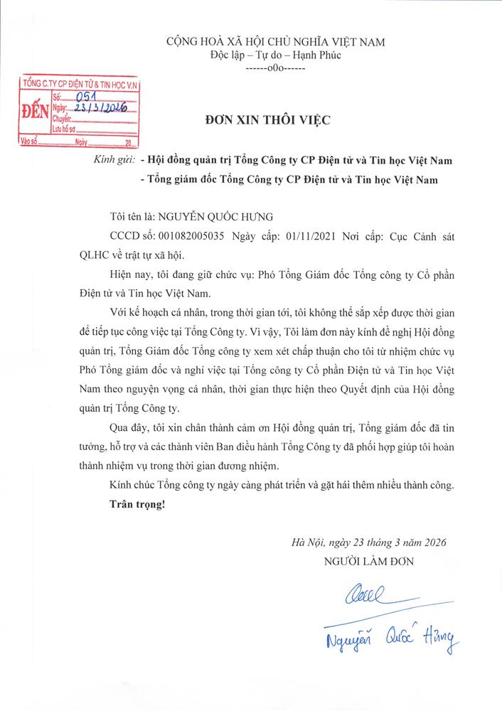 Đơn từ nhiệm của Phó Tổng Giám đốc Nguyễn Quốc Hưng